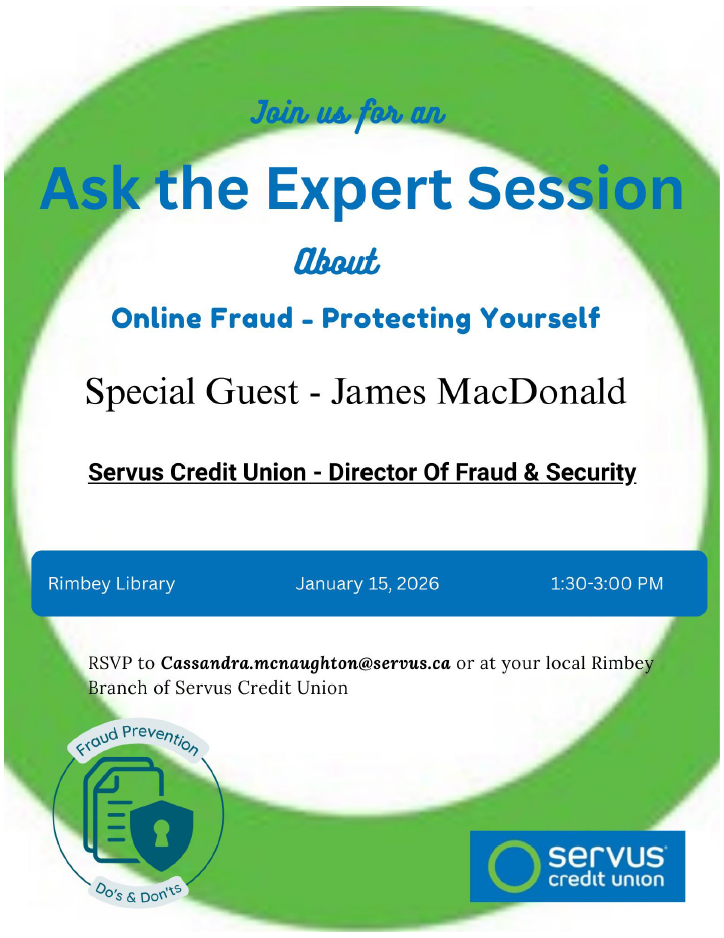 RSVP to Cassandra.mcnaughton@servus.ca or at the Servus Credit Union - Rimbey Branch